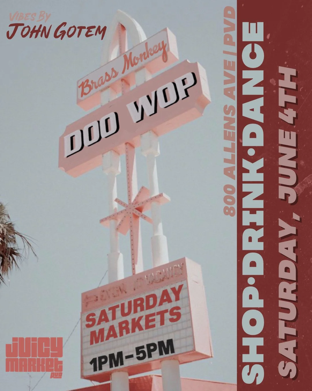 Hosted on Brass Monkey’s side patio, Juicy Market PVD feature 8 rotating vendors every Saturday from 1:00pm-5:00pm. Supporting a local Providence DJ for a summer time vibe. Order a Frozen Cocktail from Brass Monkey’s Patio window, check out some talented artists and makers.