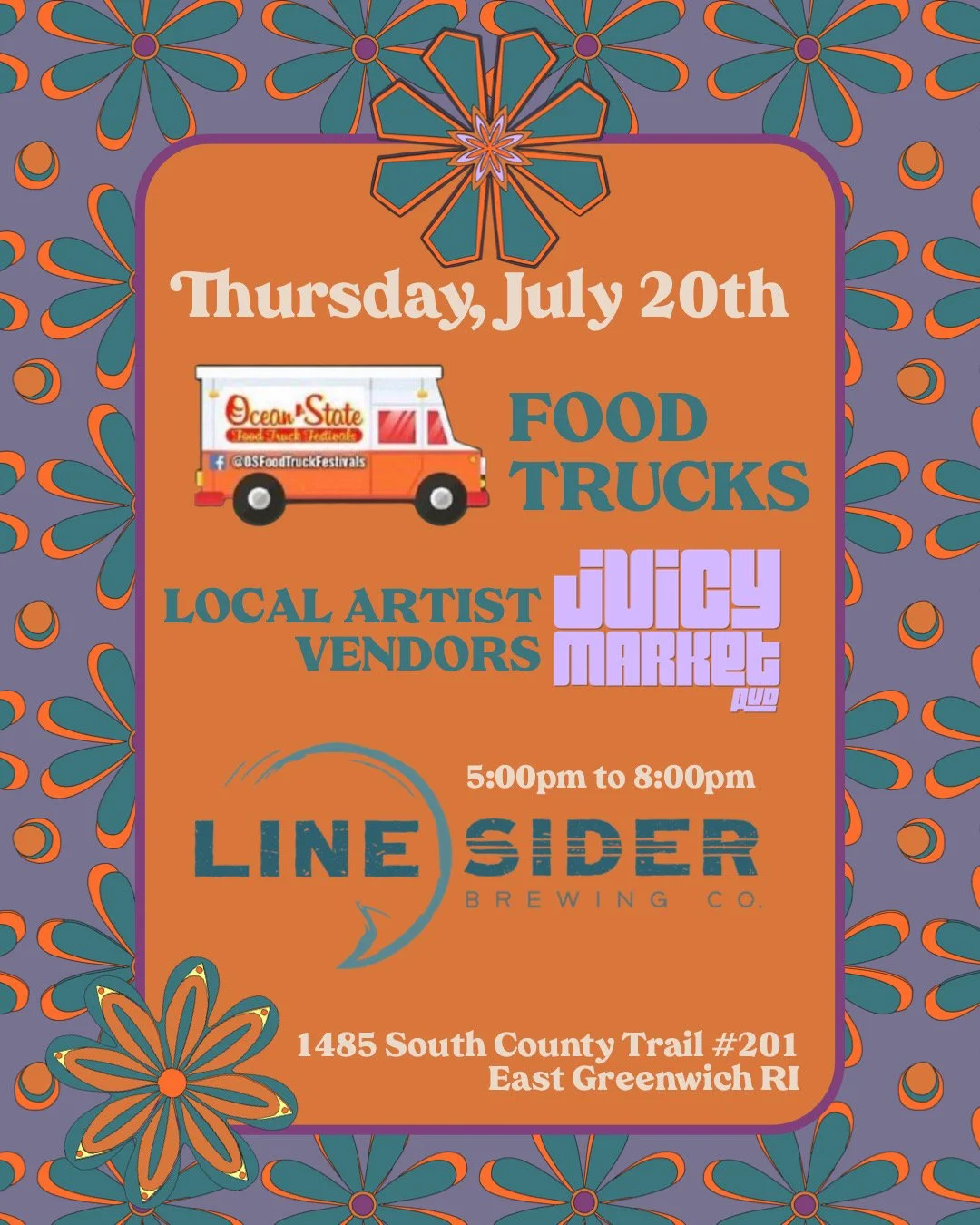 Juicy Market PVD X Ocean State Food Trucks at Linesider Thursday, July 20, 2023 5:00 PM 8:00 PM Linesider Brewing Co. 1485 South County Trail East Greenwich, RI, 02818 United States (map) Google Calendar ICS